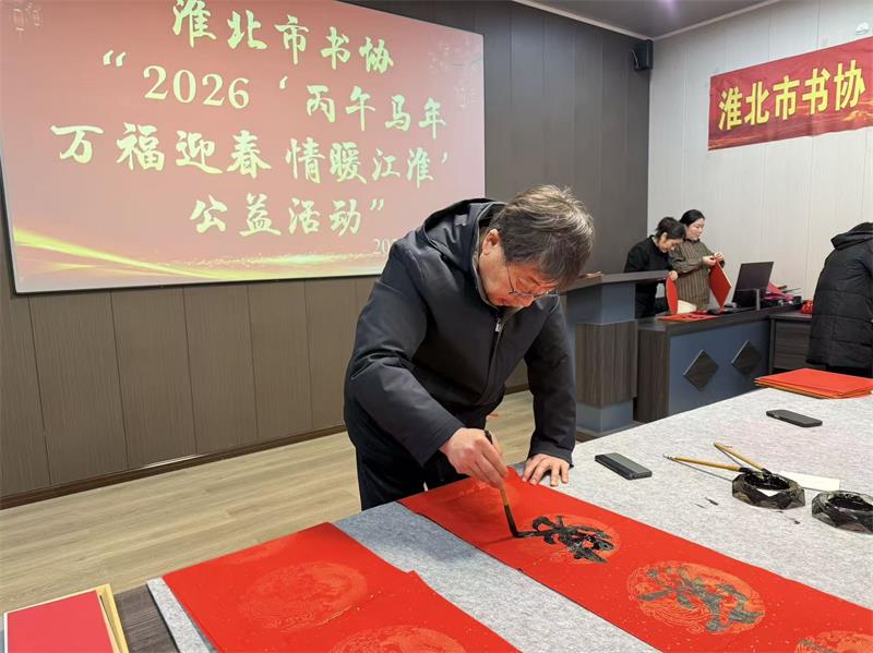 淮北市书法家协会赵主席及各位老师莅临公司,现场挥毫,为我们书写了饱含墨香与祝福的新春对联。 此次淮北市书协“2026丙午马年·万福迎春 情暖江淮”公益活动,不仅为我们带来了红红火火的节日装饰,更传递了诚挚温暖的新春祝愿!