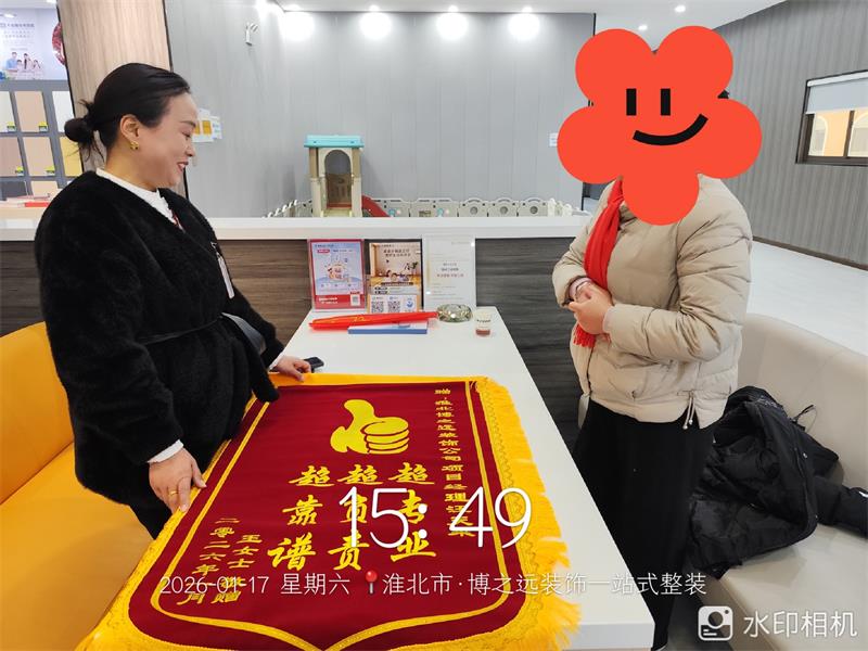 清风明月23栋1901业主在完工后专程送来锦旗,向项目经理汪天来表达诚挚感谢,