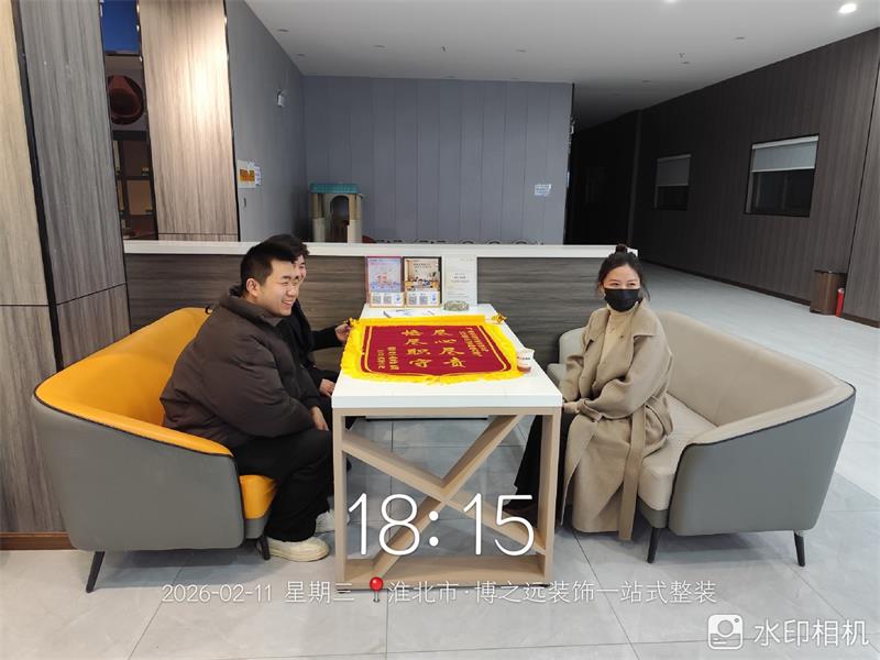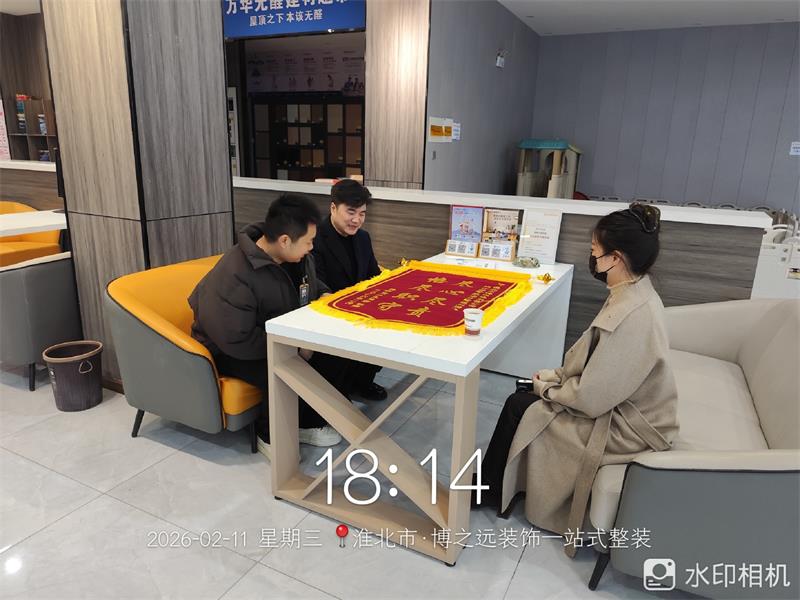 祥源府3栋2102业主在完工后专程送来锦旗,向项目经理刘腾飞,设计师董欣表达感谢,